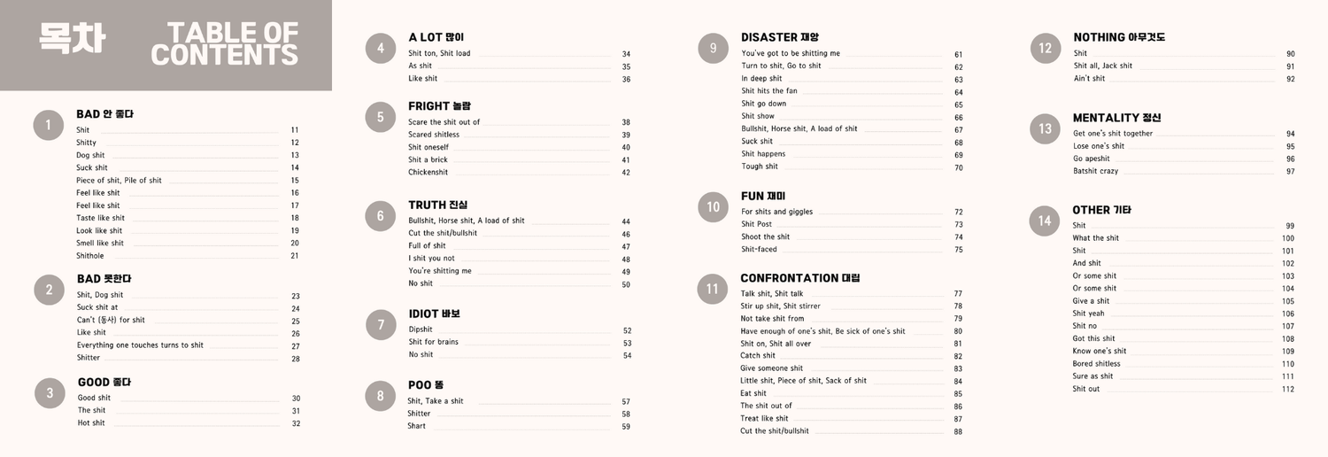 특히 이 책 안에는 'SHIT'이라는 단어가 들어간 90개 이상의 실용적인 표현과 구문들이 총망라되어 있습니다.